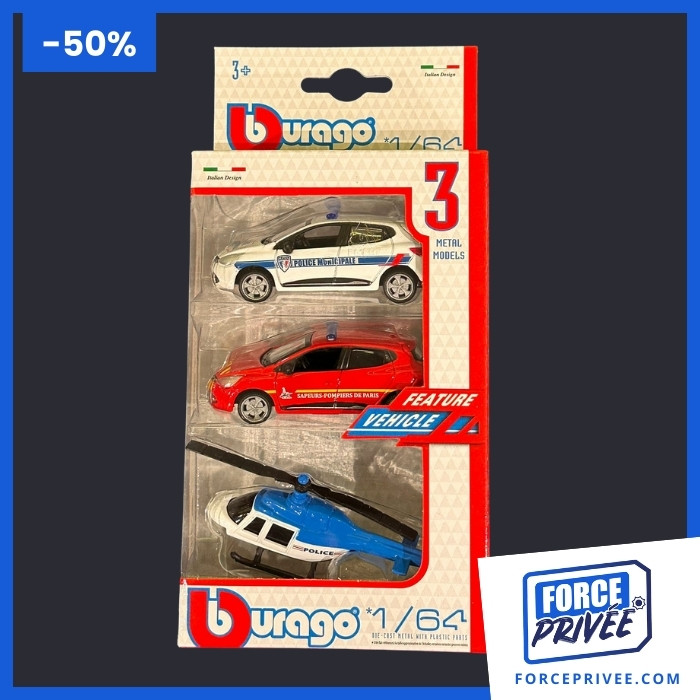 Coffret Véhicules de Secours Bburago 1:64 – Police Municipale, Pompiers de Paris & Hélicoptère