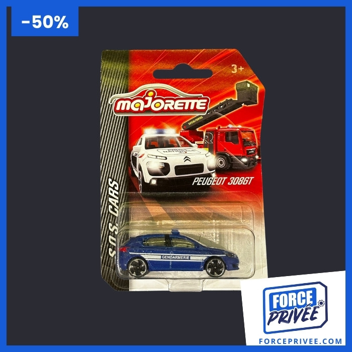 Cette Peugeot 308 GT Gendarmerie de la marque Majorette est un modèle réduit réaliste issu de la série Cars, inspirée des véhicules d’intervention français.